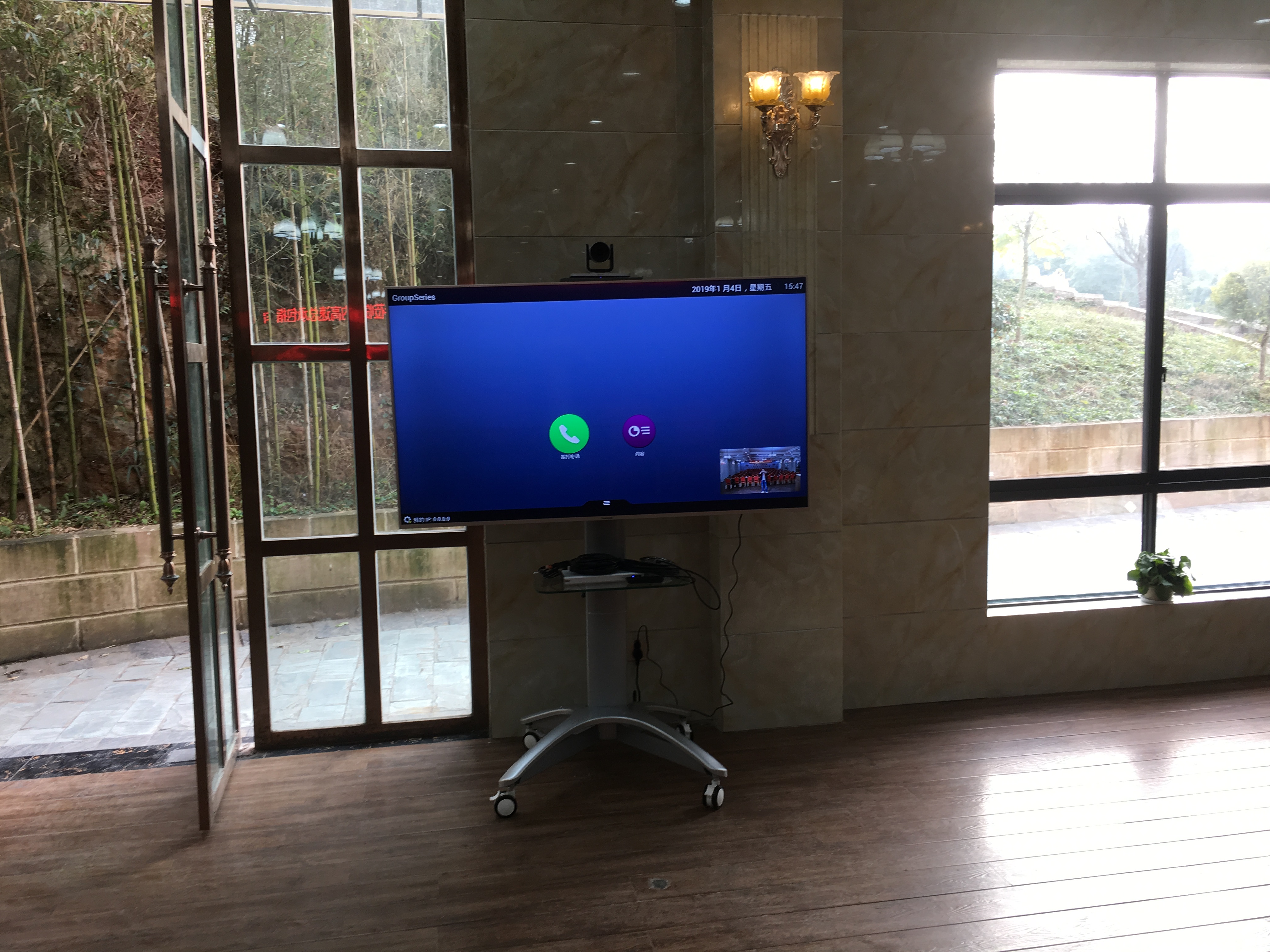大內(nèi)高速項(xiàng)目部作為該集團(tuán)下屬的一個(gè)新增項(xiàng)目部,時(shí)不時(shí)需要與上級(jí)有效溝通,于是應(yīng)集團(tuán)要求,新增一套寶利通GROUP310設(shè)備,采用60寸電視機(jī)+移動(dòng)支架方式,加入集團(tuán)總部的寶利通視頻會(huì)議系統(tǒng)中。
